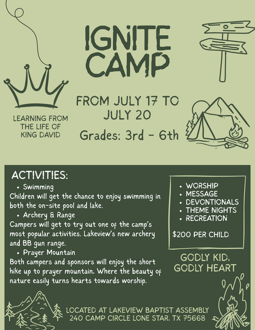 Parents Mark Your Calendars! Children's Camp will be this Summer July 17th-20th! For Kids who have Completed 3rd Grade- 6th Grade! The Cost is $200 but Scholarships are available upon request!